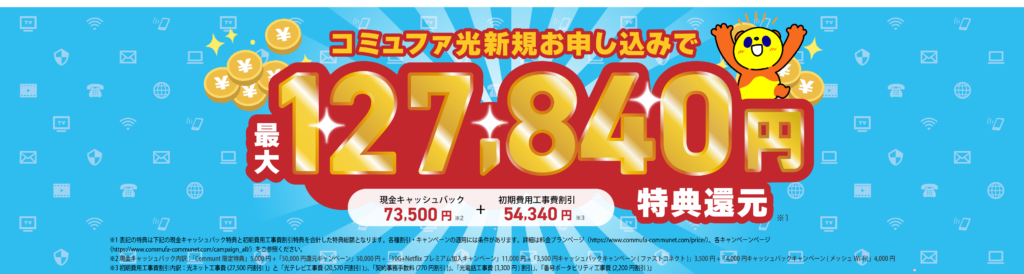 ※2 現金キャッシュバック内訳:「Communt限定特典」5,000円+「50,000円還元キャンペーン」50,000円+「10G+Netflixプレミアム加入キャンペーン」11,000円+「3,500円キャッシュバックキャンペーン(ファストコネクト)」3,500円+「4,000円キャッシュバックキャンペーン(メッシュWi-Fi)」4,000円